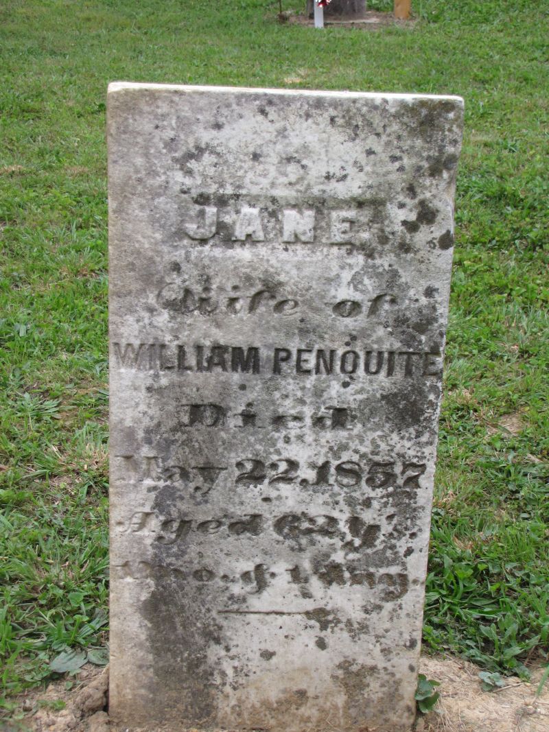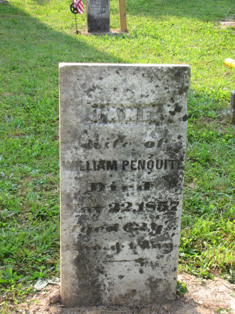 Jane Penquite wife of William Penquite died May 22, 1857 aged 62 years 1 month & 1 day |