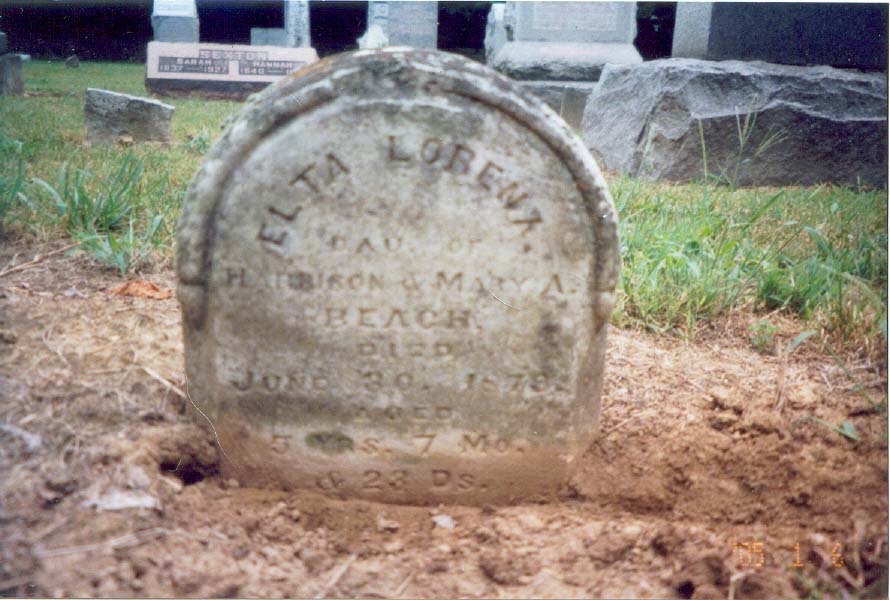 Elta Lorena Beach dau. of Harrison & Mary A. Beach died June 30, 1878 aged 5 years 7 months & 23 days |