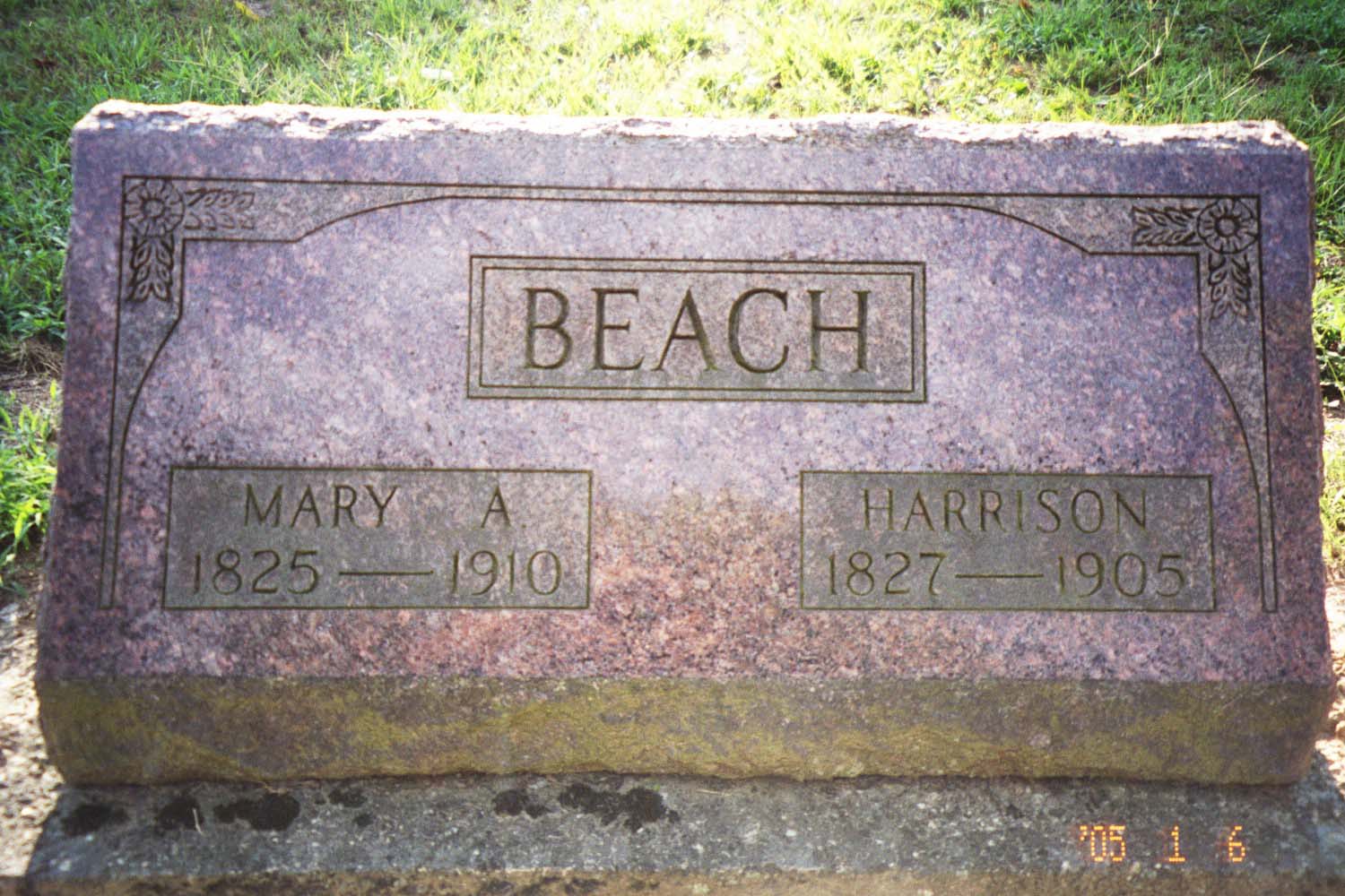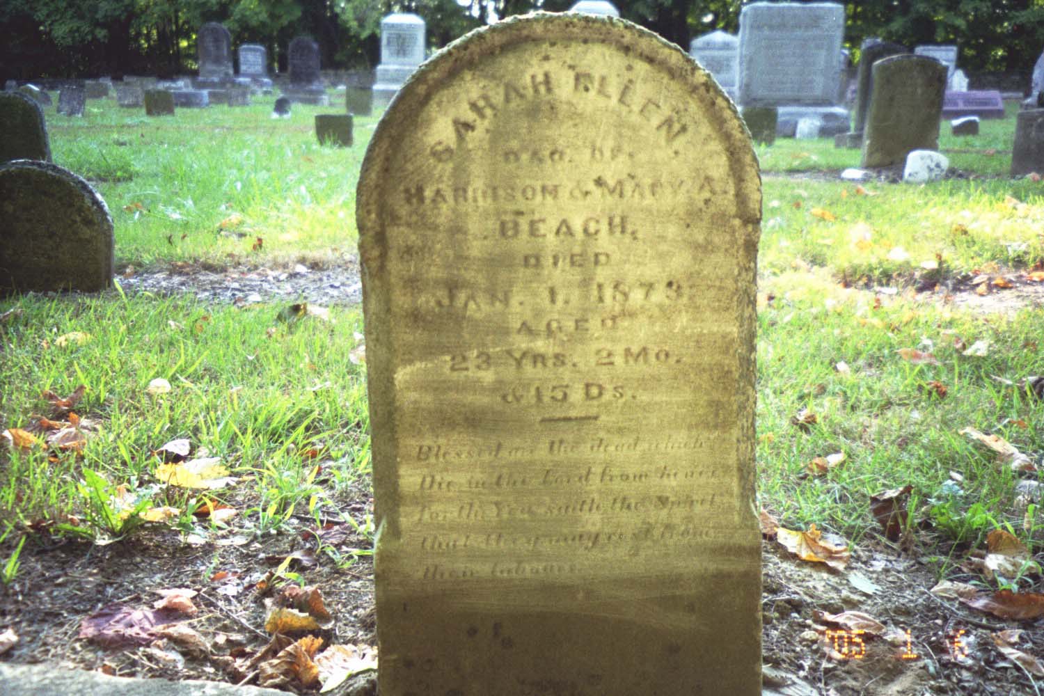 Sarah Ellen Beach dau. of Harrison & Mary A. Beach died Jan. 1, 1879 aged 23 years 2 months & 15 days |