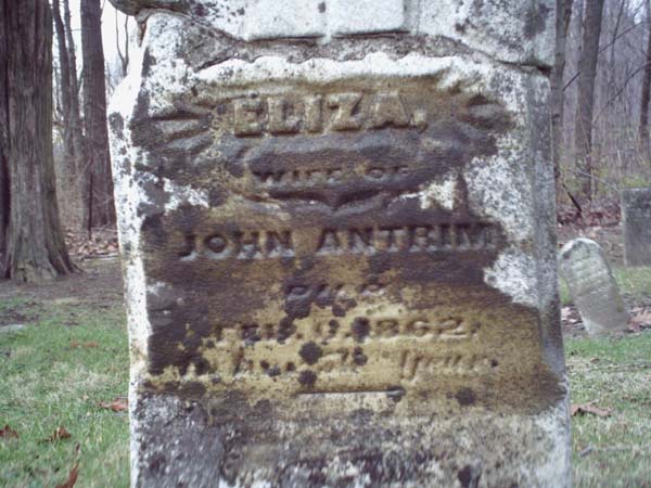 Eliza Antrim [worn stone - Warren County Cemetery Records Volume 6 had died Feb 6, 1862 in her 56th year] |