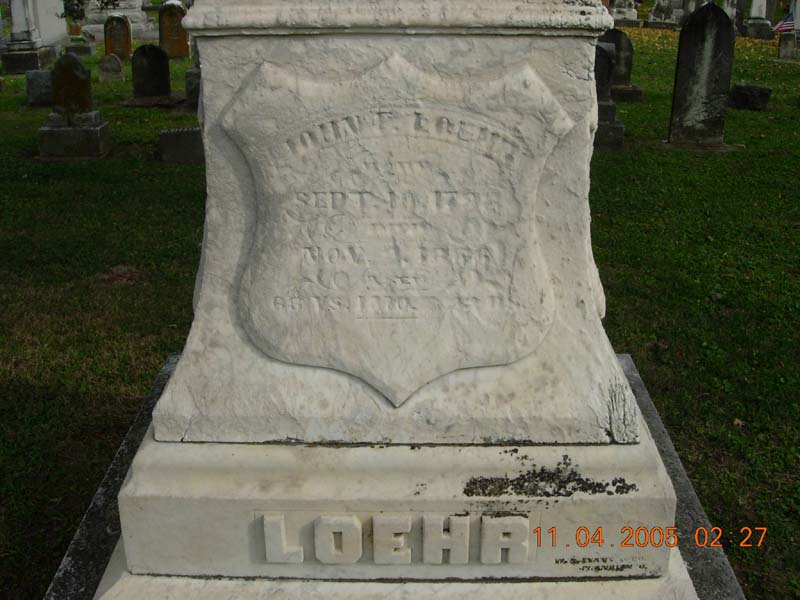 John F. Loehr born Sept. 10, 1798 died Nov. 2, 1866 aged 68 years 1 month 22 days |