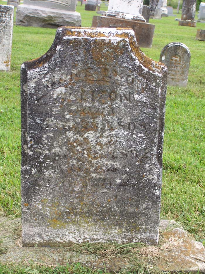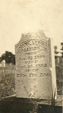 Jane Lyon Allison born Jan. 23, 1808 died Sep. 14, 1882 aged 73 years 7 months 22 days 20 Oct 2014 email from Amy Ford Molyneux email: "My name is Amy Ford Molyneux and I am the great great great granddaughter of Jane Lyon Allison. In clearing out my paternal grandmother’s home, I found these old pictures of Jane Lyon Allison’s gravestone in West Woodville Cemetery?? as well as her old family home in Blanchester OH. I noticed on your website that the photo you have shows that the gravestone is quite weathered. This picture was probably taken shortly after her death by her daughter, Ellen Allison Quinn, my great great grandmother. I do not know if you know this information, but was curious to know if the old house is still standing. In any case, any information you have about Jane Lyon Allison would be greatly appreciated. I have recently discovered after doing a little research that she is was the daughter of an American Revolutionary War Hero, Lieutenant Thomas Lyon, one of the Green Mountain Boys as well as a delegate to the NY Constitutional Convention. She was actually born in Whitehall (Washington County) NY before moving to Harborcreek in Erie PA where she met and married Robert Allison. Thereafter, they moved to Chicago IL and it is my understanding Robert Allison drowned in the river at an early age leaving her a young widow with 7 children, one being my great great grandmother Ellen Allison Quinn, who eventually moved to Mobile AL and made her home here." |