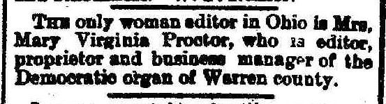 | The only woman editor in Ohio is Mrs. Mary Virginia Proctor, who is editor, proprietor and business manager of the Democratic organ of Warren county. Source: The Decatur (Illinois) Daily Republican, September 28, 1893 |
