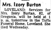 Izory (Bryant) Burton (1881-1962) BURTON MRS. IZORY BURTON LOVELAND: Services for Mrs. Izory Burtan, 82, of Oregonia, will be held at 1 p. m. tomorrow in the Tufts Funeral Home, Lovelanld. She died Wednesday Source: "Burton," obituary, Cincinnati Post, undated clipping |