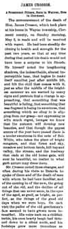 JAMES, CROSSON Mr. Crosson noted these changes, and often during his visits to Batavia he spoke of them and of the death of men with whom he had been familiar, and of the coming in of the new, the going out of the old, and the decline of all things that can never seem, in the eyes of the aged, as good, as bright, as perfect, as the things of the good old days when we were boys. On each visit the pallor of the old gentleman's face seemed to have grown more intensified. His voice took on a childish treble, his once hearty laugh had thinned down to a silent smile, and his footsteps grew more tremulous as |