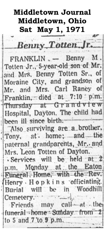 The child had been ill since birth. Source: The Middletown (Ohio) Journal, Saturday May 1, 1971 |