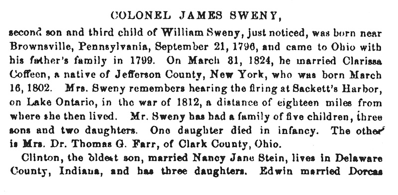 Combination Atlas Map of Warren County Ohio: Compiled, Drawn and Published From Personal Examinations and Surveys (Philadelphia: L. H. Everts, 1875), page 18 3/4 CAPTAIN ELI SWENY, In June, 1841, Captain Sweny married Mrs. Lucy Ann Lockwood, whose maiden name was Brasher. She was born January 23, 1807, in Cincinnati. Her father was a native of New York, and emigrated to Ohio about the year 1794. Captain Sweny has had a family of five children, one son and four daughters,