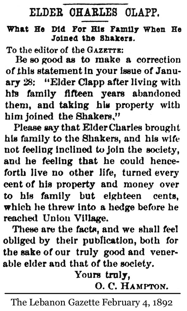 CHARLES CLAPP. To the editor of the Gazette: Please say that Elder Charles brought his family to the Shakers, and his wife not feeling inclined to join the society, and he feeling that he could henceforth live no other life, turned every cent of his property and money over to his family but eighteen cents, which he threw into a hedge before he reached Union Village. These are the facts, and we shall feel obliged by their publication, both for the sake of our truly good and venerable elder and that of the society. Yours truly, |