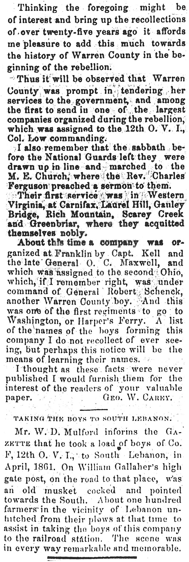 my possession and they are as follows: Privates Thinking the foregoing might be of interest and bring up the recollections of over twenty-five years ago it affords me pleasure to add this much towards the history of Warren County in the beginning of the rebellion. Thus it will be observed that Warren county was prompt in tendering her services to the government, and among the first to send in one of the largest companies organized during the rebellion, which was assigned to the 12th O. V. I., Col. Low commanding. I also remember that the Sabbath before the National Guards left they were drawn up in line and marched to the M. E. Church, where the Rev. Charles Ferguson preached a sermon to them. Their first service was in Western Virginia, at Carnifax, Laurel Hill, Gauley Bridge, Rich Mountain, Scarey Creek and Greenbriar, where they acquitted themselves nobly. About this time a company was organized at Franklin by Capt. Kell and the late General O. C. Maxwell, and which was assigned to the second Ohio, which, if I remember right, was under command of General Robert Schenck, another Warren County boy. And this was one of the first regiments to go to Washington, or Harper’s Ferry. A list of the names of the boys forming this company I do not recollect of ever seeing, but perhaps this notice will be the means of learning their names. I thought as these facts were never published I would furnish them for the interest of the readers of your valuable paper. Geo. W. Carey Mr. W. D. Mulford informs the Gazette that he took a load of boys of Co. F, 12th O. V. I., to south Lebanon, in April, 1861. On William Gallaher’s high gate post, on the road to that place, was an old musket cocked and pointed towards the South. About one hundred farmers in the vicinity of Lebanon unhitched from their plows at that time to assist in taking the boys of this company to the railroad station. The scene was in every way remarkable and memorable. |
